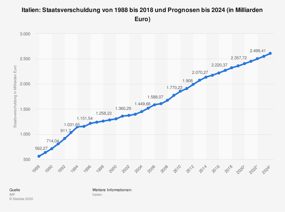 Noch ein kleiner Rückblick in die wirtschaftliche und finanzpolitische Vergangenheit Italiens gefällig? Seit dem wirtschaftlichen Aufschwung der 60iger und 70iger Jahre hat es keine italienische Regierung und damit das italienische Volk geschafft eine gewisse Stabilität in die italienische Fiskalpolitik zu bringen. Waren es in der Jahren bis zur Einführung des Euros entweder massive Zinserhöhungen oder regelmässige Abwertungen der italienischen Lira, die das Land und die Produkte vor dem Aussterben bewahrt haben, Seit dem Jahr 2000 haben sich die öffentlichen Schulden in Italien von ca 1,3 Billionen Euro auf 2,32 Billionen Euro mehr als verdoppelt. 2019 entging die Regierung in Rom nur knapp einem Brüsseler Strafverfahren, Missmanagement und Korruption in Banken brachten das italienische Finanzsystem weit nach 2008 in grösste Schwierigkeiten. Staatliche Garantien und Übernahmen retteten die Institute und die massiv überschuldete Bevölkerung.