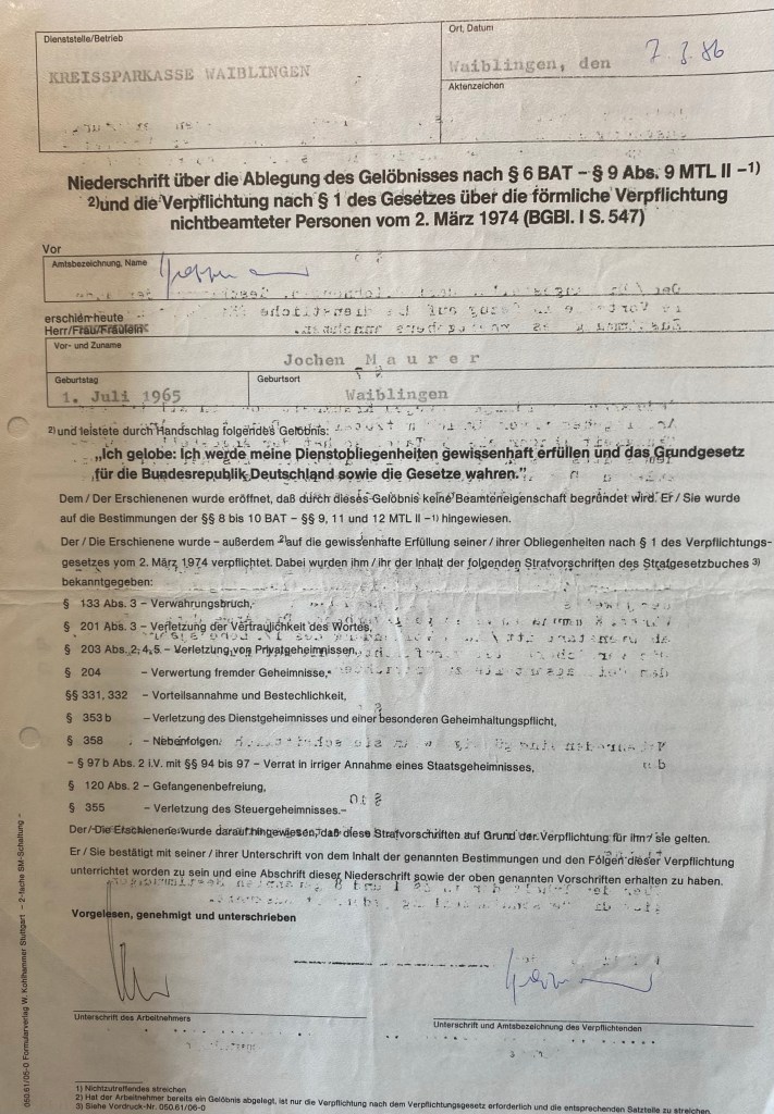 Ausgestattet mit 2 Hosen, 3 Hemden und einem Sakko startete ich meine Ausbildung zum Bankkaufmann bei der Kreissparkasse Waiblingen. Waiblingen eine mittelgroße Stadt im Speckgürtel von Stuttgart.